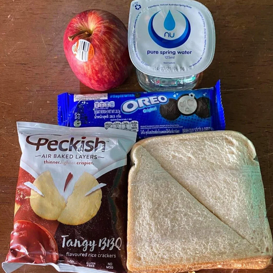 A fresh sandwich (usually ham and cheese), piece of fruit, two snacks, one home made like a muffin and one prepackaged snack. When it is possible in the budget we add in a juice popper.